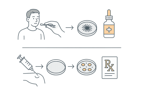 検査では、まず膿や浸出液を綿棒などで拭い、検体を採取します。この検体を、細菌の発育に適した培地に塗り、培養します。真菌と同様に、数日後には原因菌がコロニーを形成します。
