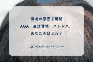 男性の薄毛の大部分は、男性ホルモンと遺伝が関与する「AGA(男性型脱毛症)」が原因です。AGAは、ヘアサイクル(毛周期)が乱れ、髪の毛が太く長く成長する前に抜け落ちてしまう状態を指します。